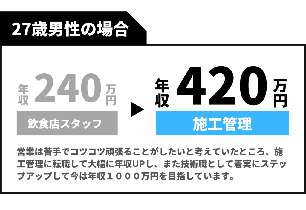 営業、人事、事務、エンジニア、販売、施工管理など未経験からでも高収入が目指せる職種をメインにご紹介が可能です。